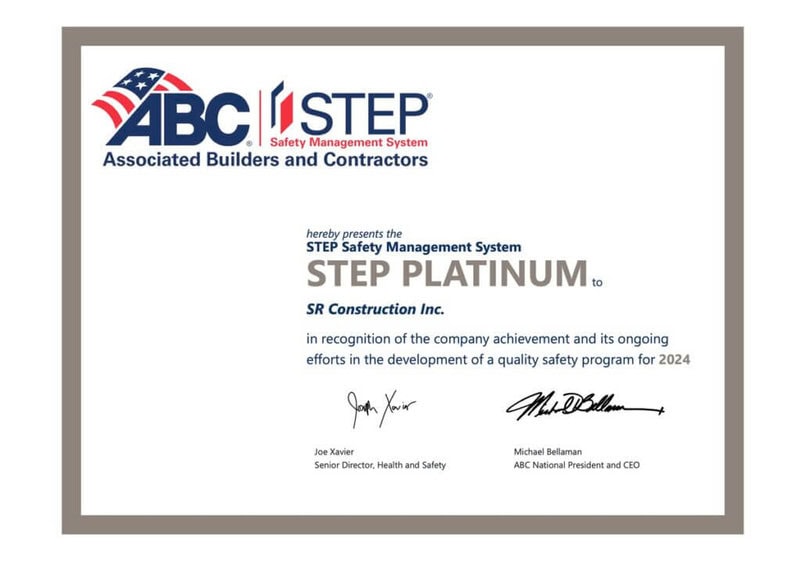 SR Construction is proud to have been awarded the Platinum STEP Safety Award, recognizing our commitment to safety excellence. ABC’s Safety Training Evaluation Process (STEP) is a benchmarking tool that improves safety performance across the construction industry. STEP participants, like SR Construction, are 688% safer than the industry average and experience an 85% reduction in TRIR rates, proving the power of prioritizing safety on every job, no matter the company size or type of work.